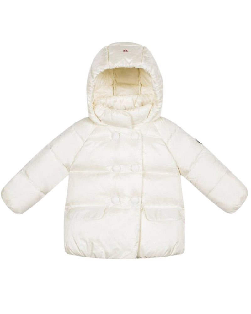 3-feather jacket, fixed hood, double-breasted fastening with clips, pockets with fake flaps.