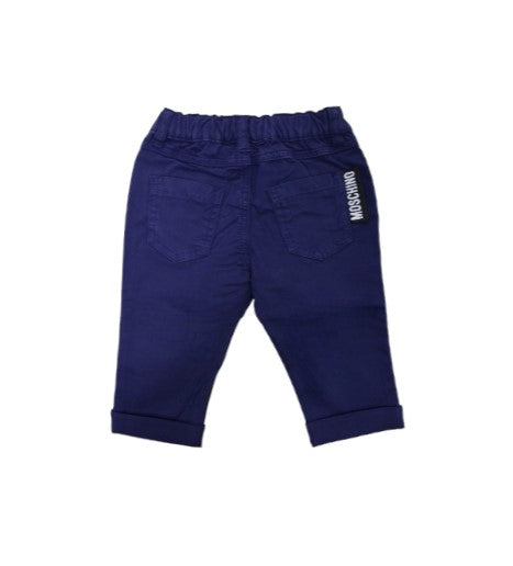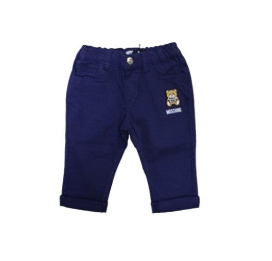 Five-pocket trousers, elasticated waist, front snap button fastening. Moschino Teddy Bear patch and logo on the front.