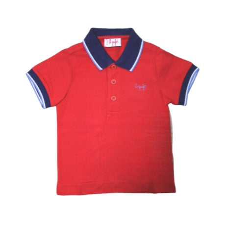 Short sleeve polo shirt with collar, front button placket. Embroidered logo on chest.