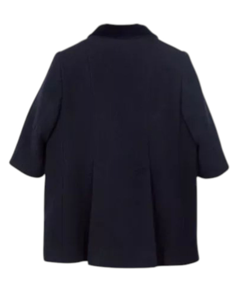 Cappotto doppiopetto realizzato in pura lana vergine da neonata. Presenta colletto tondo, maniche lunghe, chiusura con bottoni sul davanti e due tasche con patta laterali. Dettagli di bottoni, tasche e colletto rivestiti in velluto.