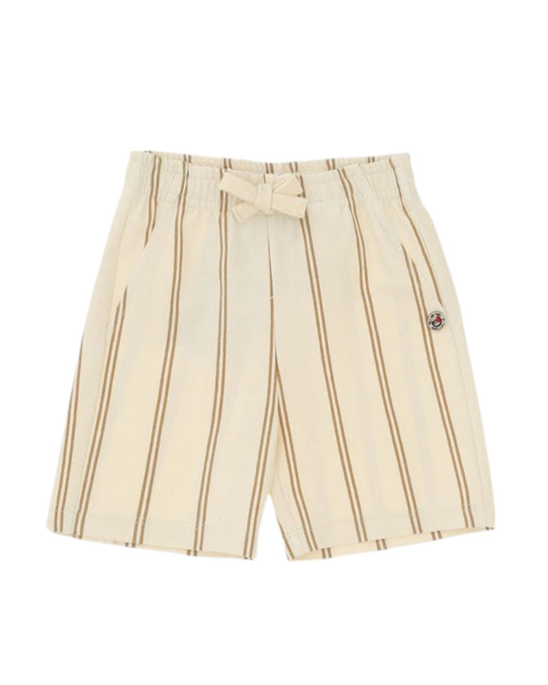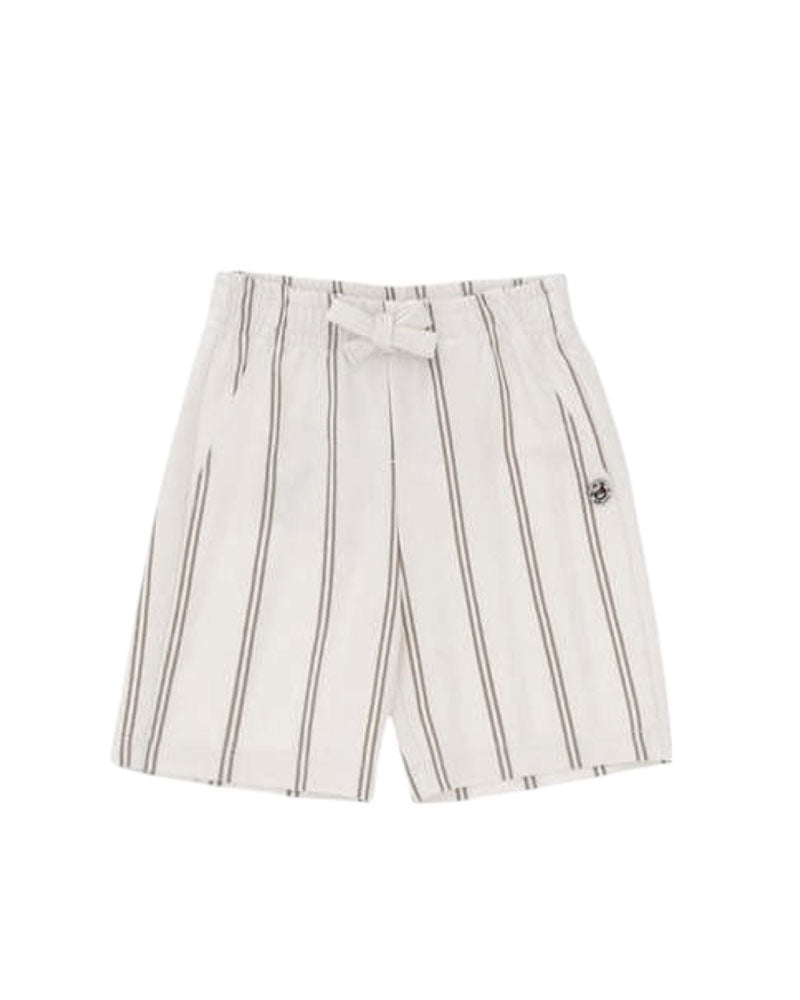 Bermuda realizzato in cotone in fantasia rigata, vita elasticizzata, coulisse in vita, tasche laterali.