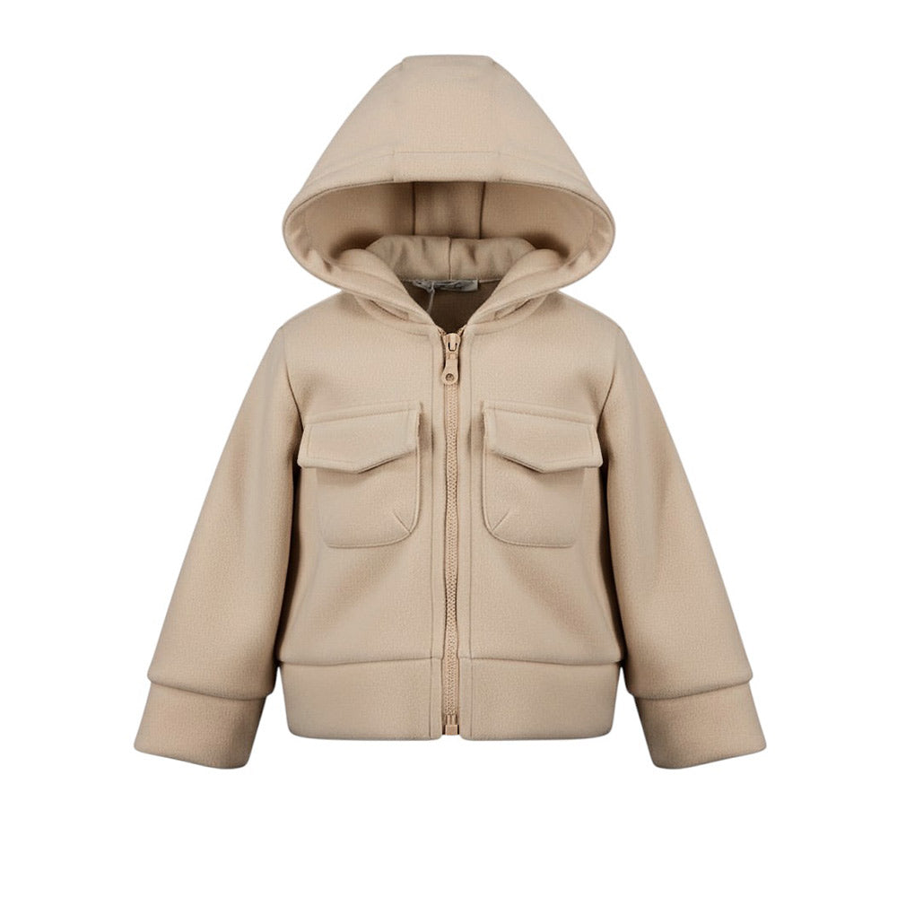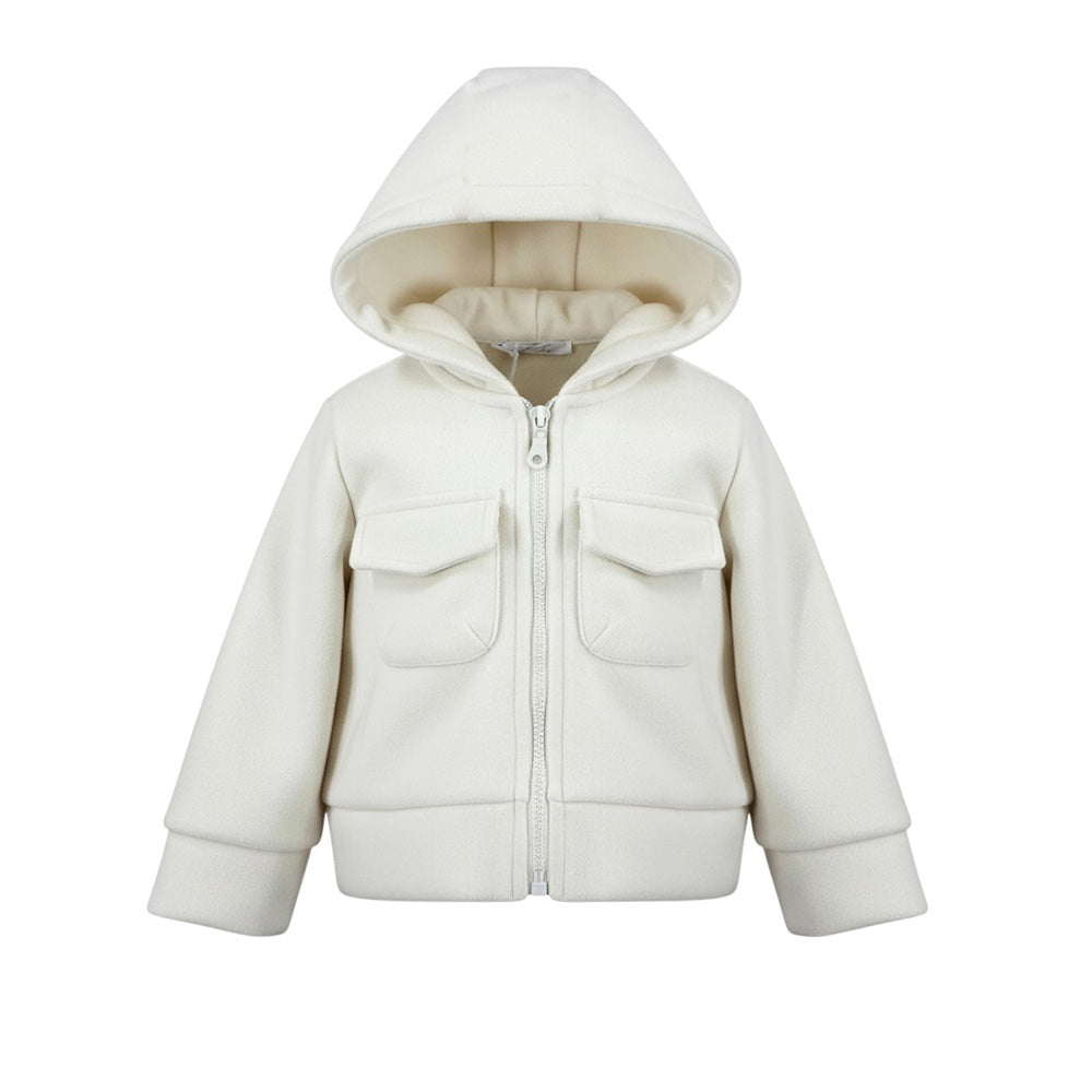 Giacca con cappuccio in panno da neonato. Presenta maniche lunghe, chiusura frontale con zip e due tasche con patta applicate sul petto.