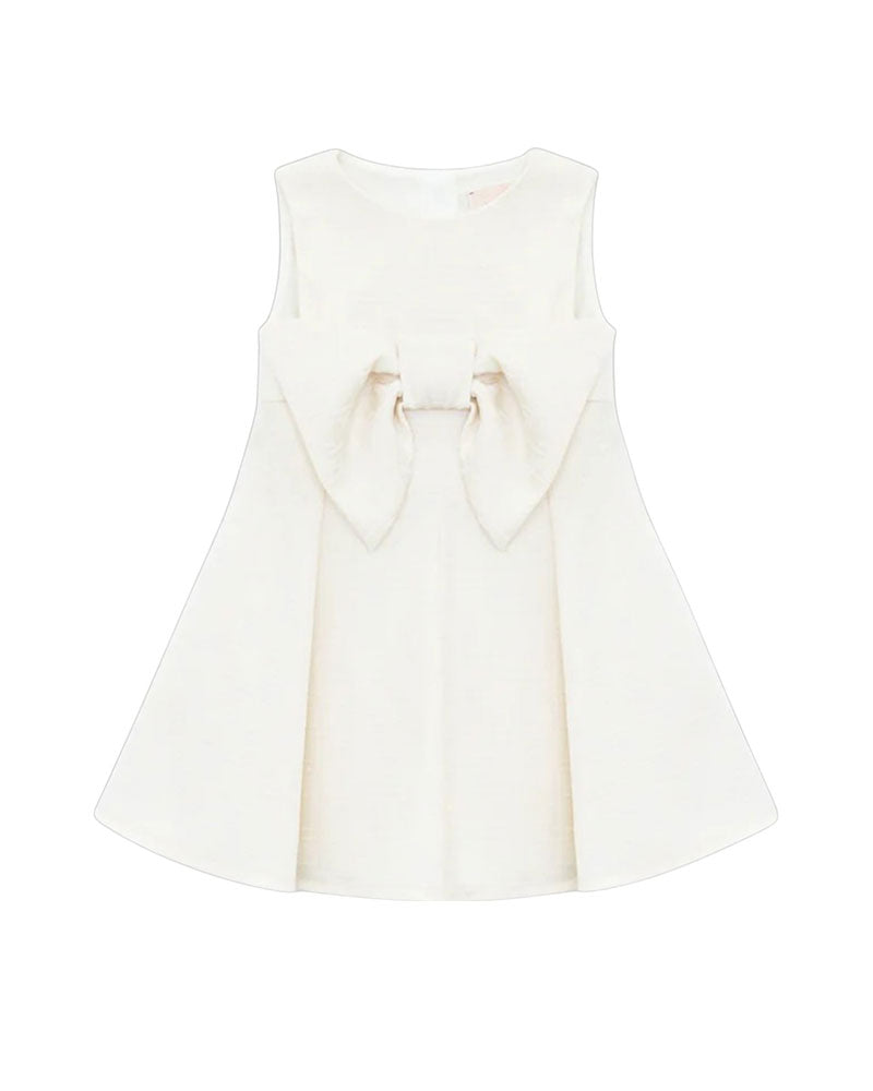 Elegante abitino in duchesse smanicato, con scollo rotondo, a tinta unita, chiusura sul retro con zip, taglio in vita, gonna ampia e applicazione fiocco in tinta con monogramma del logo ricamato sul fronte. Per un look raffinato e chic. ELISABETTA FRANCHI