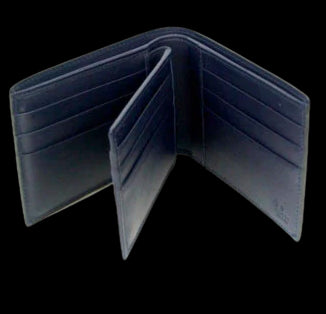 Portafogli Gucci in pelle blu. Modello orizzontale con struttura quadrifold. Sezione interna removibile e utilizzabile autonomamente. Una tasca portabanconote. Misure 12,5cm x 9,5cm x 2cm