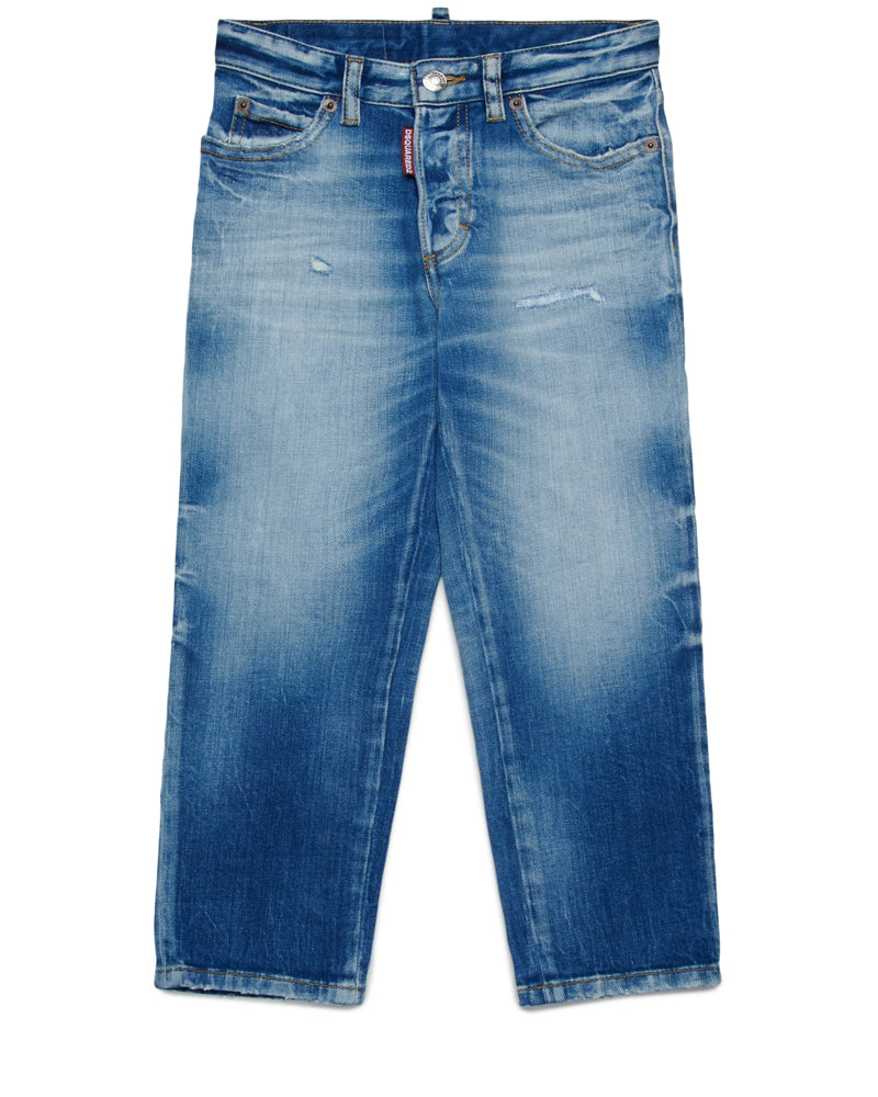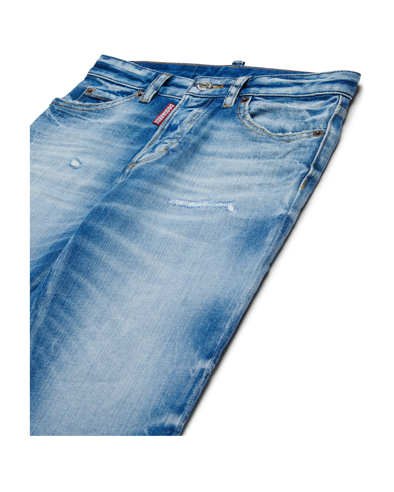 Jeans a cinque tasche modello Boss 10 dal fit straight. Realizzato in denim blu medio, contraddistinto da sfumature e baffature a contrasto cromatico. Rotture e abrasioni fronte-retro. Label Dsquared2 applicata sulla patta (logo a bandierina).