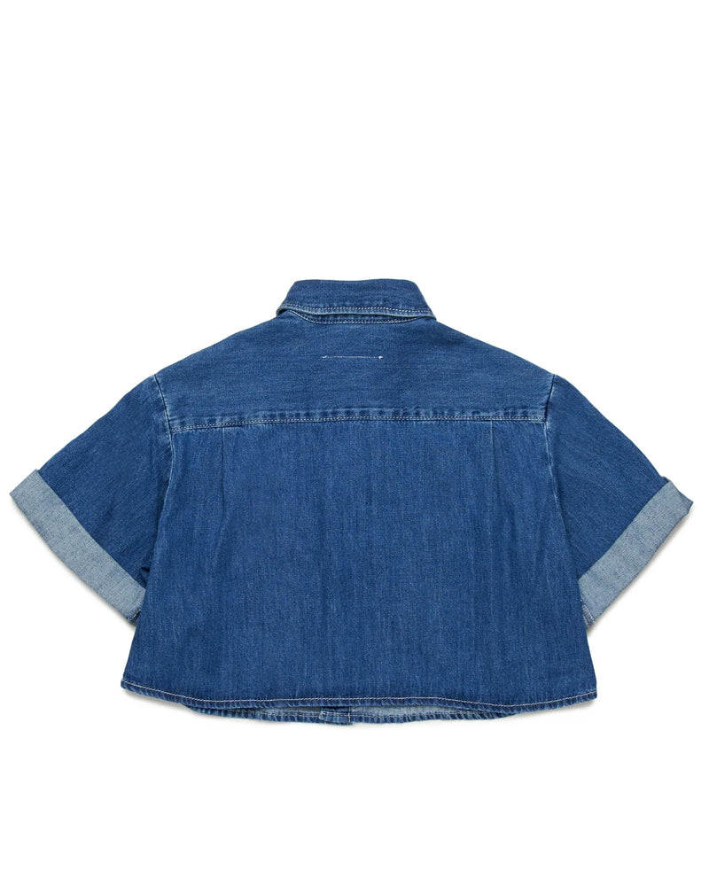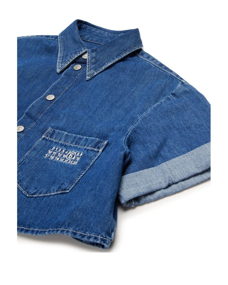 Camicia cropped realizzata in denim di cotone. Presenta colletto a punta, chiusura frontale con bottoni a pressione, maniche corte con risvolto e taschino applicato sul davanti. È decorata con numeric logo ricamato sul davanti.