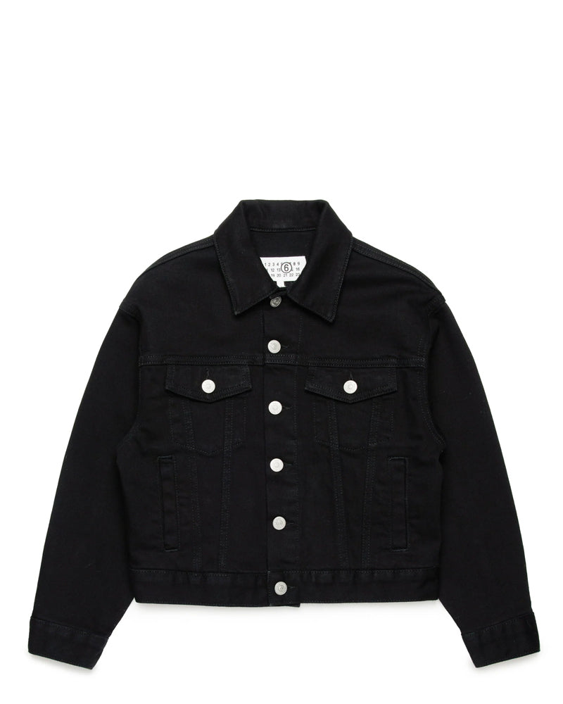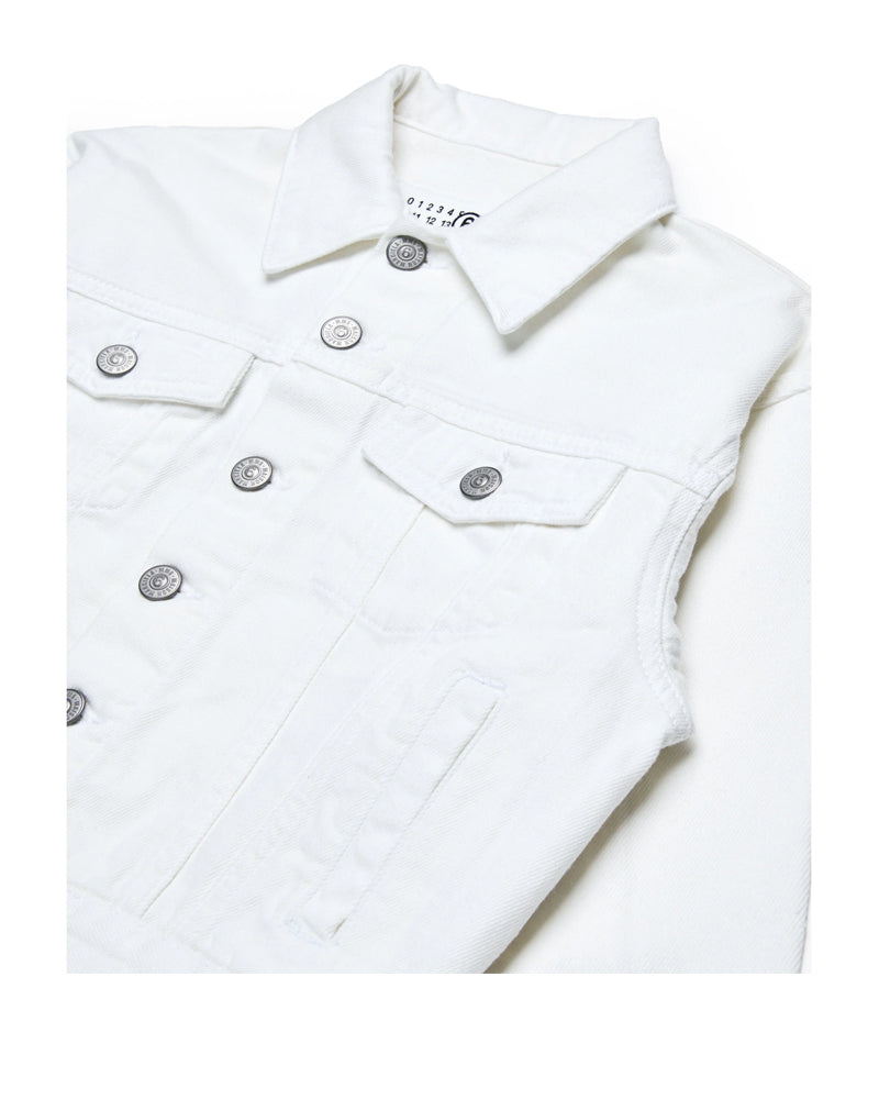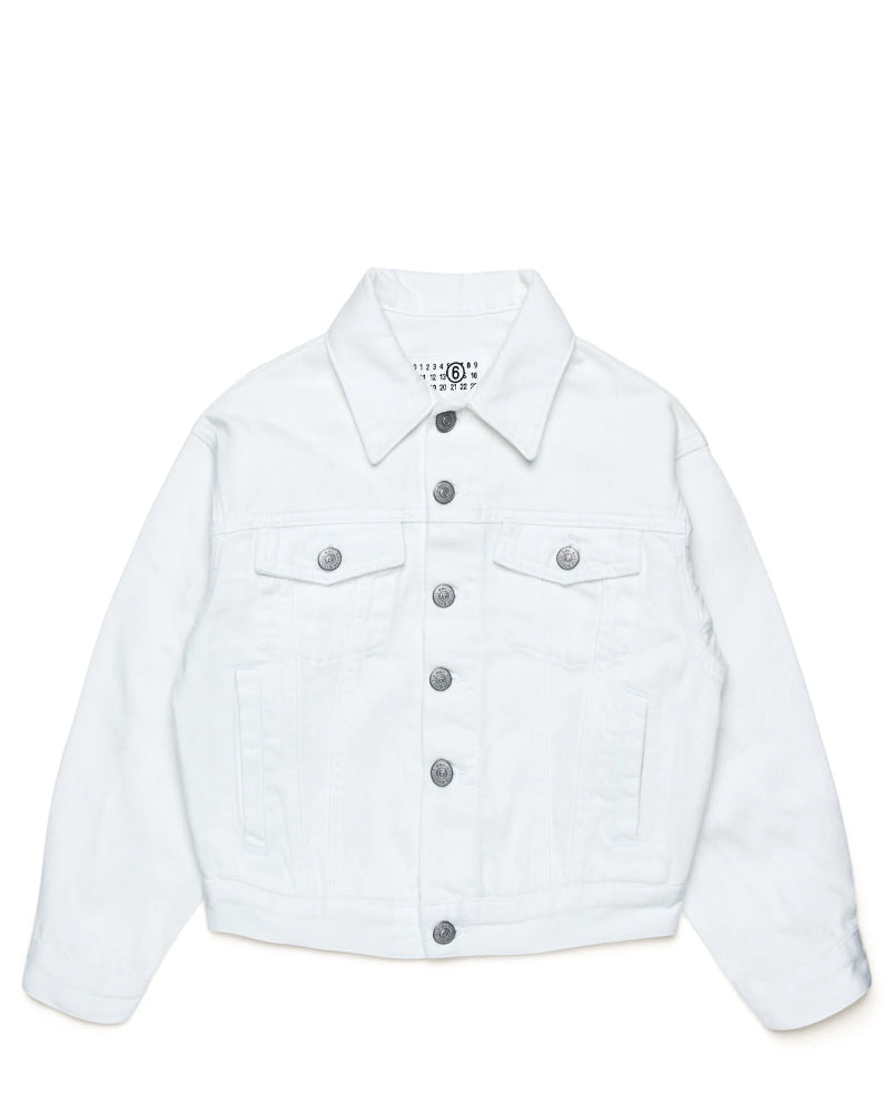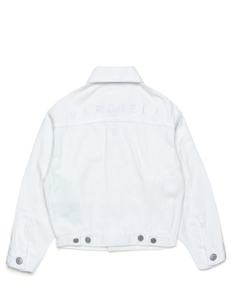 Giubbino realizzato in denim di cotone. Presenta colletto a punta, chiusura frontale con bottoni, maniche lunghe, due tasche laterali a filo e due tasche con patta applicate sul petto. È decorato con logo ricamato tone on tone sul retro.