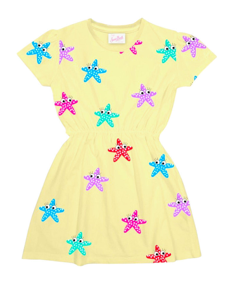 Abito Leila realizzato in jersey di cotone da bambina. Presenta collo rotondo, maniche corte, punto vita elasticizzato. È decorato con stampa Starfish Girl all-over e con logo ricamato sulla manica.