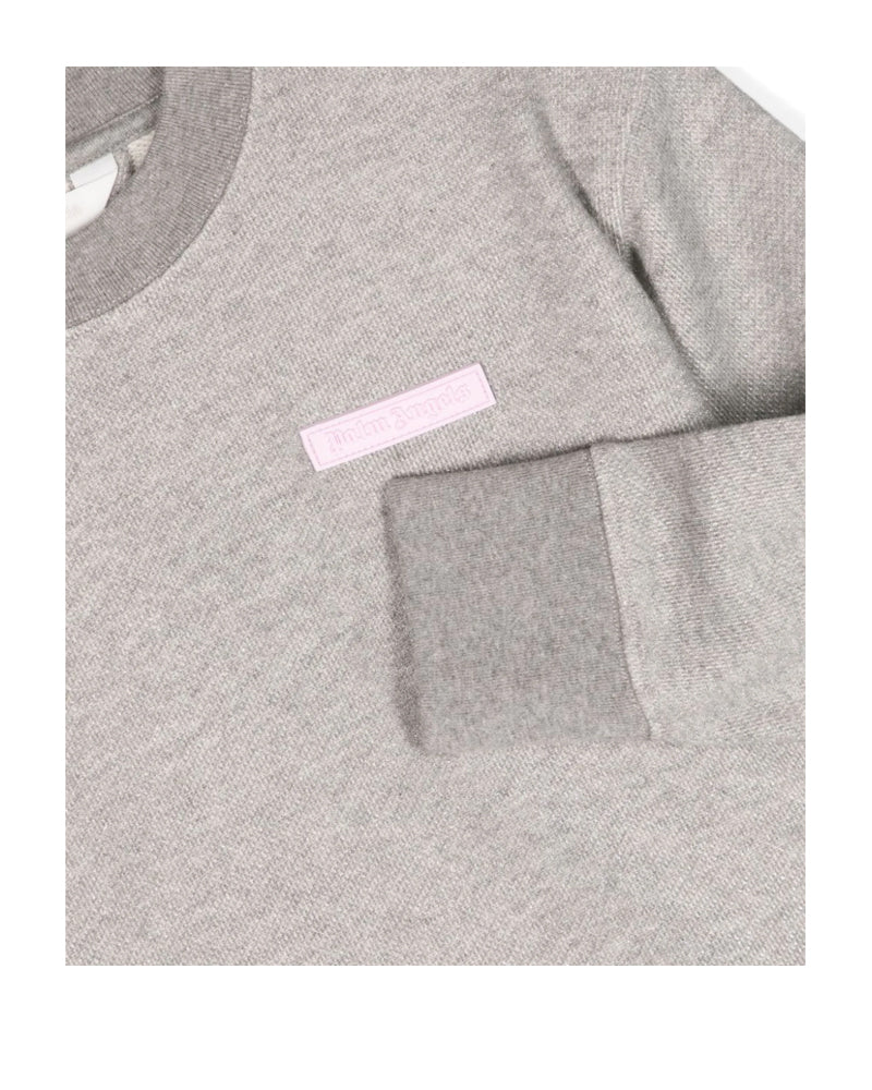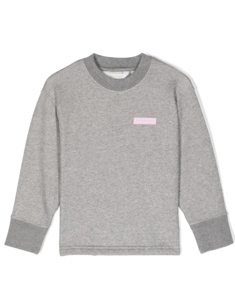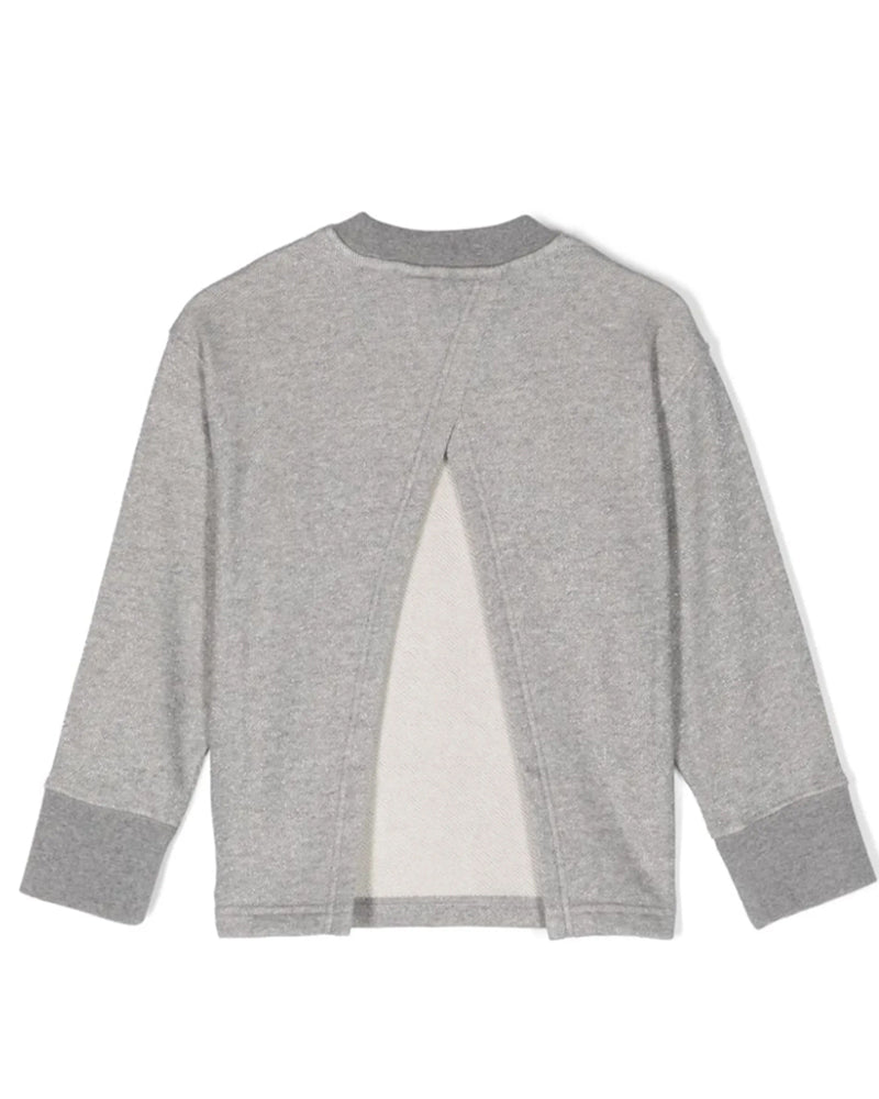 Felpa in cotone lamé con schiena scoperta, effetto mélange, dettaglio lurex, applicazione con logo sul petto, girocollo, maniche lunghe, polsini a coste, dettaglio cut-out, orlo dritto, tessuto in spugna, finiture in costa.