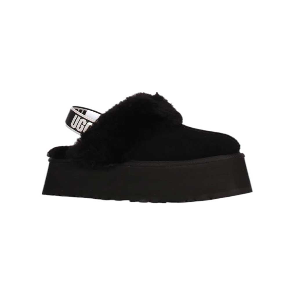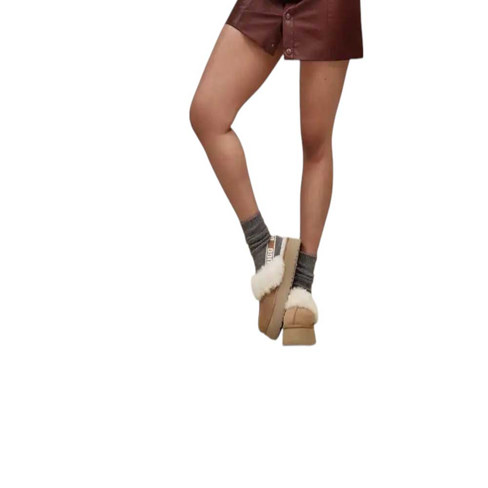Le ciabatte Ugg Mules Platform 1113474 Funkette combinano sostenibilità e comfort avanzato. Realizzate con un innovativo composto a base di schiuma di canna da zucchero, riducono l’uso di combustibili fossili sostituendo l’etilene tradizionale. La tomaia in camoscio e il collarino in montone garantiscono morbidezza e calore, mentre il cinturino elastico con grafica UGG® assicura una calzata stabile. La fodera e la soletta in montone da 10 mm offrono un’ammortizzazione naturale, completate dalla suola in EVA leggera e resistente. Il tacco di 5,08 cm aggiunge un tocco di eleganza senza rinunciare al comfort.