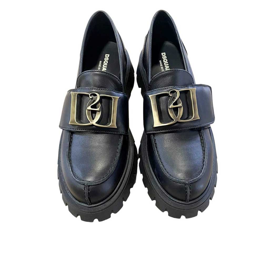 Sulla parte superiore presenta una fascia in pelle con una grande fibbia decorativa in metallo dorato che forma le lettere intrecciate “D2”, tipico logo del marchio Dsquared2 (visibile anche all’interno della scarpa, dove è stampato "DSQUARED2 – MADE IN ITALY").
