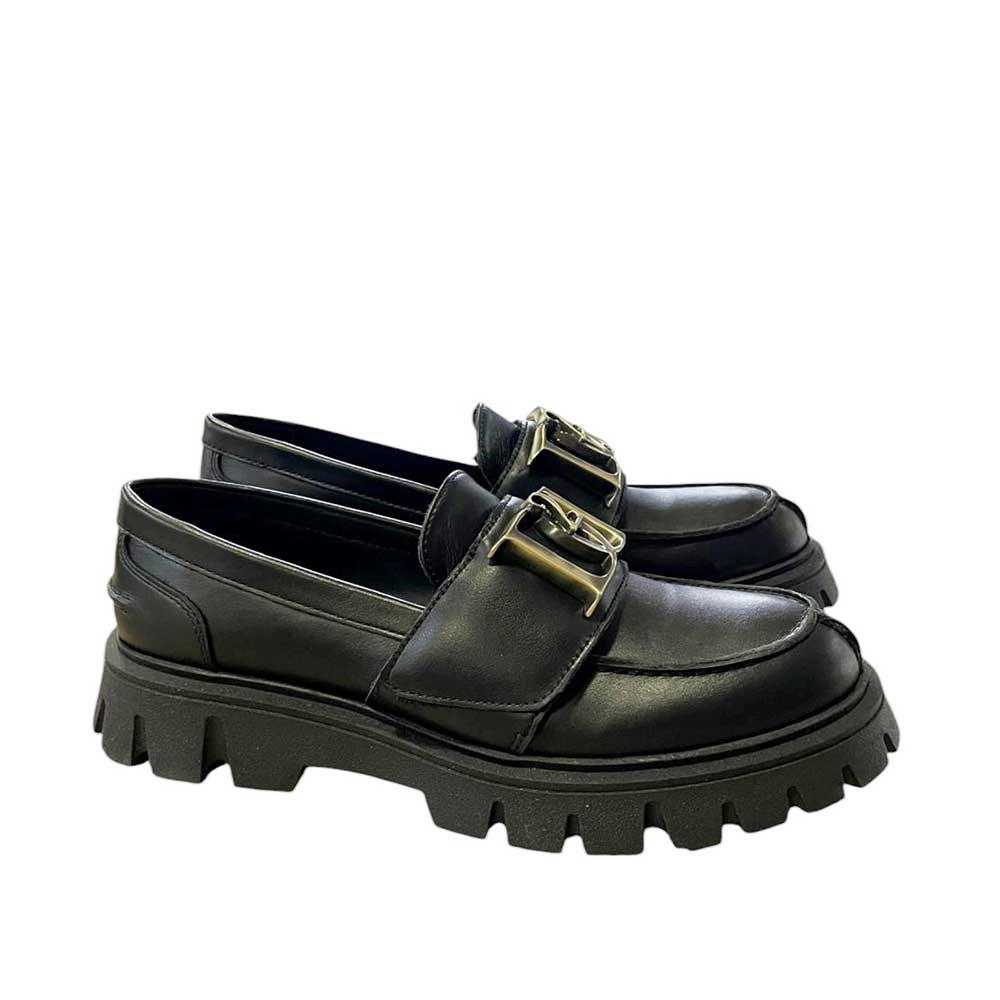 Mocassino nero in pelle con suola spessa e carrarmato, dal design robusto e moderno.