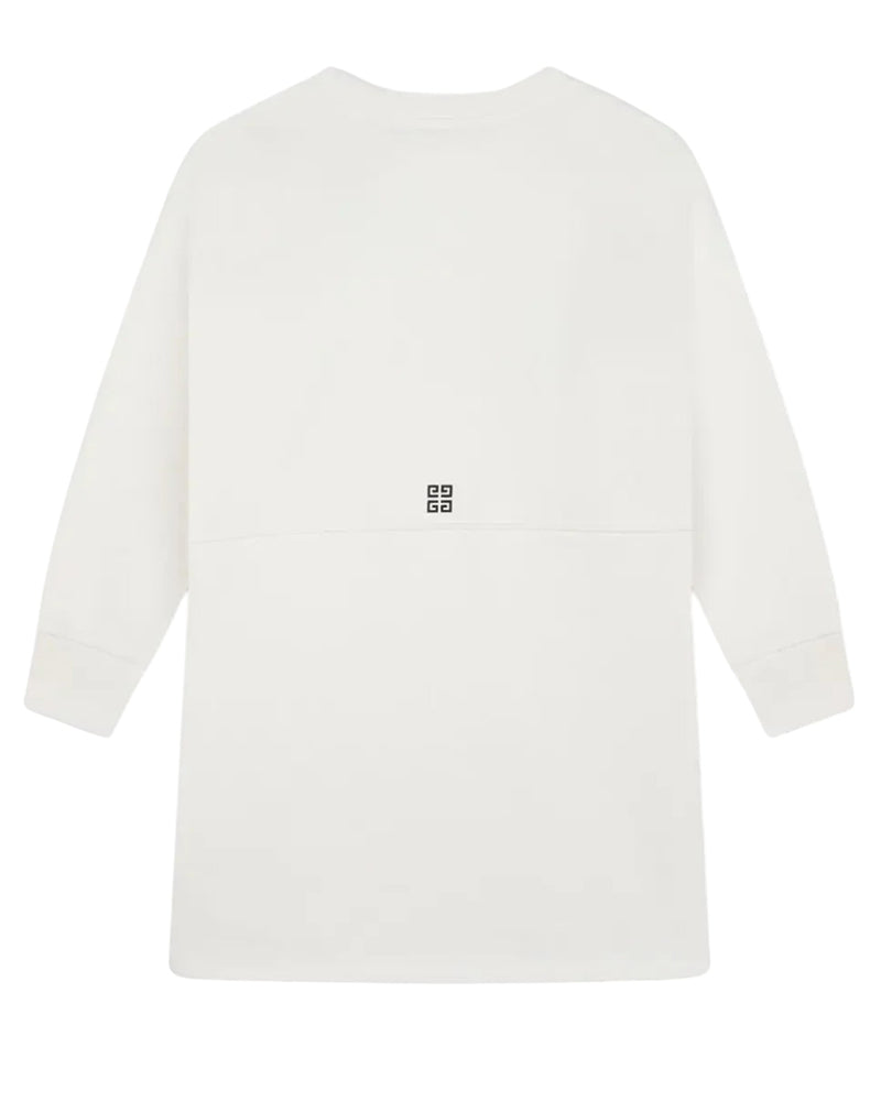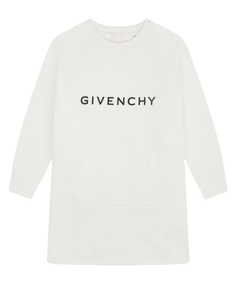 Abito da bambina realizzato in felpa di cotone garzato. Presenta collo tondo, maniche lunghe, tasca a marsupio sul davanti, fodera in pile e finiture a coste. È decorato con stampa logo sulla parte anteriore.