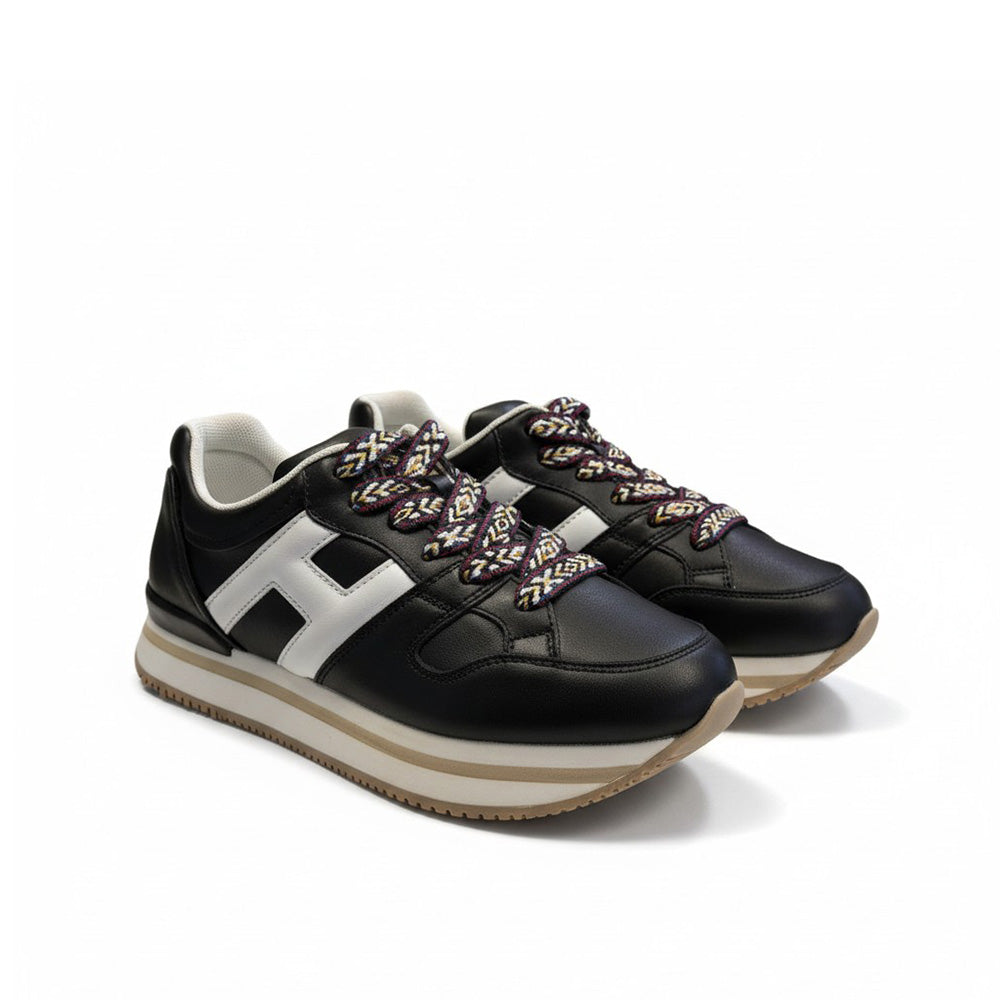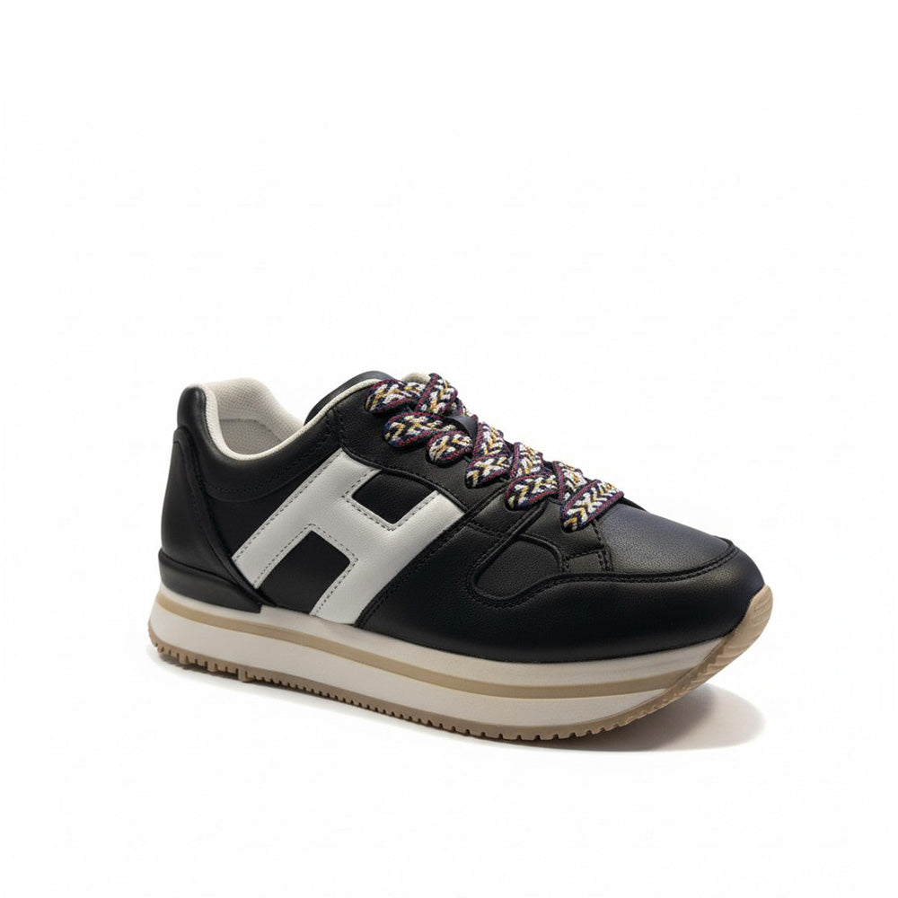 La tomaia è realizzata in pelle, con il logo Hogan a forma di “H” applicato lateralmente in pelle bianca a contrasto. Il modello presenta lacci colorati. La suola platform ultraleggera di 5,5-6 cm.