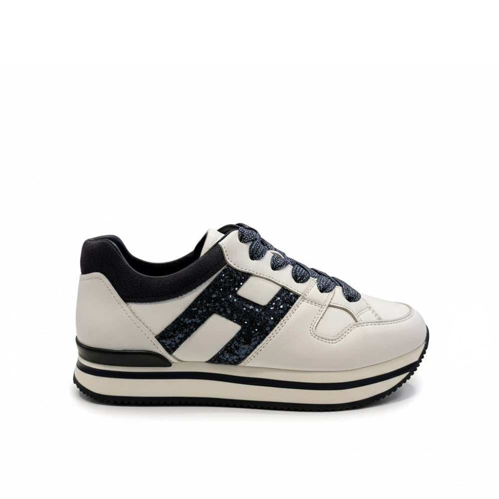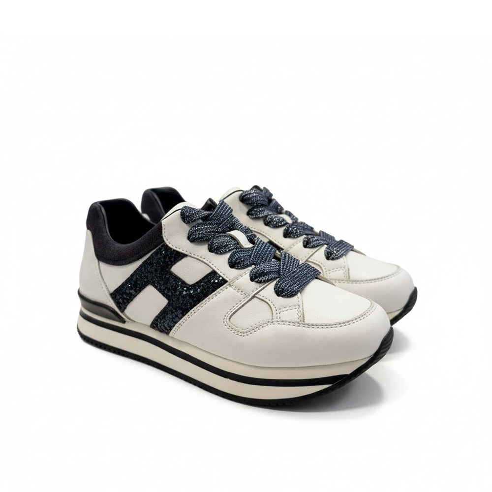 Hogan Sneakers Platform Bianche e Blu con Glitter. Tomaia in morbida pelle liscia bianca, impreziosita dall’iconica “H” laterale e dal talloncino a contrasto in tessuto con effetto glitter blu notte/scuro. I lacci in lurex blu, la suola in gomma ultraleggera.