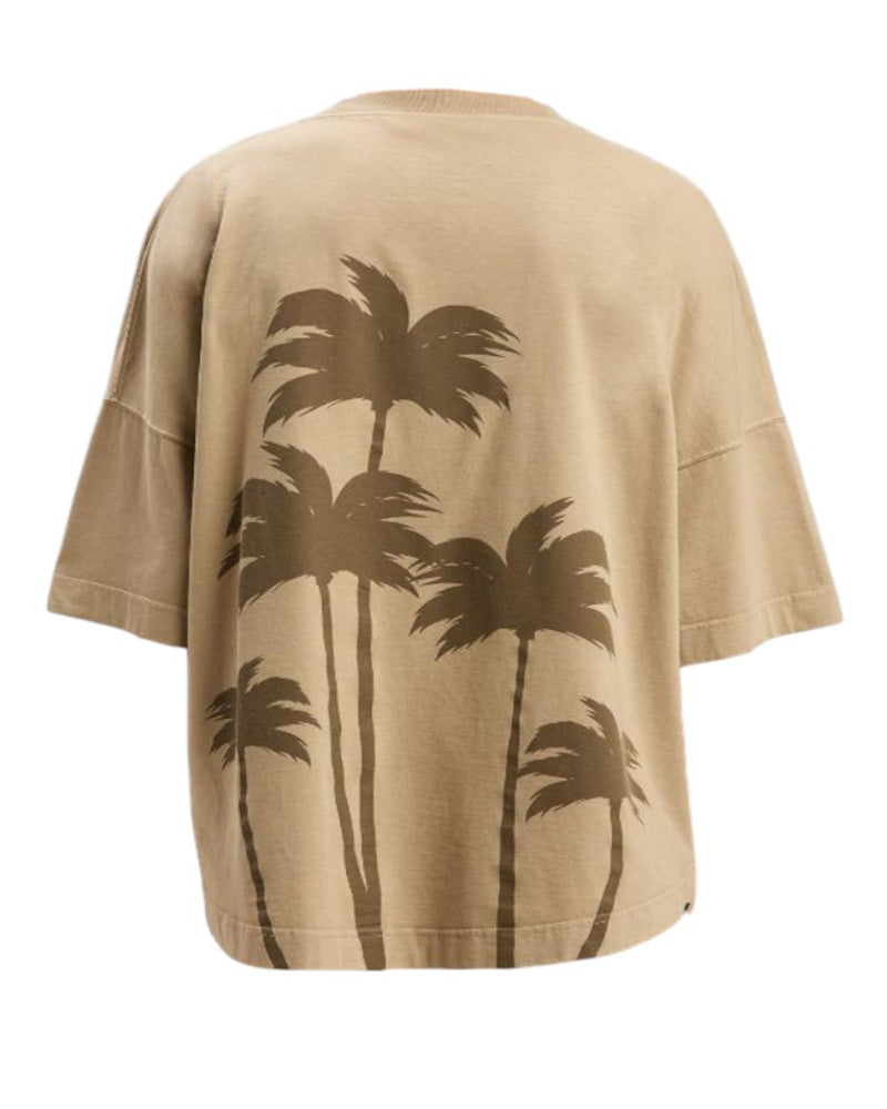 T-shirt girocollo a maniche corte tinta in capo con logo e stampa palme sul davanti e motivo a palme stampato tono su tono sul retro, vestibilità oversize.