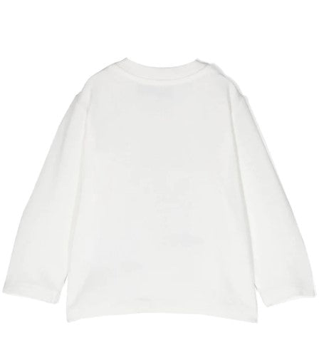 Crew neck T-shirt with long sleeves, button fastening on the shoulder, logo and symbol printed with applications.
