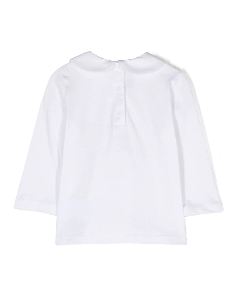T-shirt a maniche lunghe realizzata in jersey di cotone da neonata. Presenta colletto Peter Pan, motivo zig zag ricamato sul davanti, chiusura con bottoncini a pressione sul retro e orlo dritto.