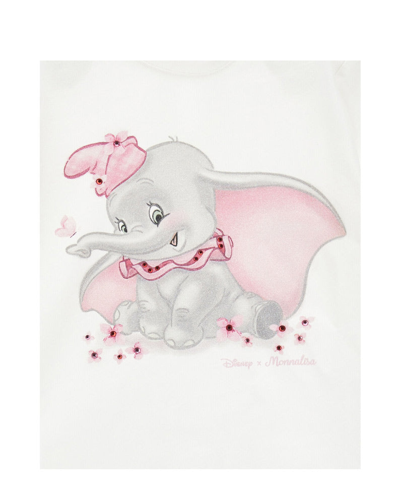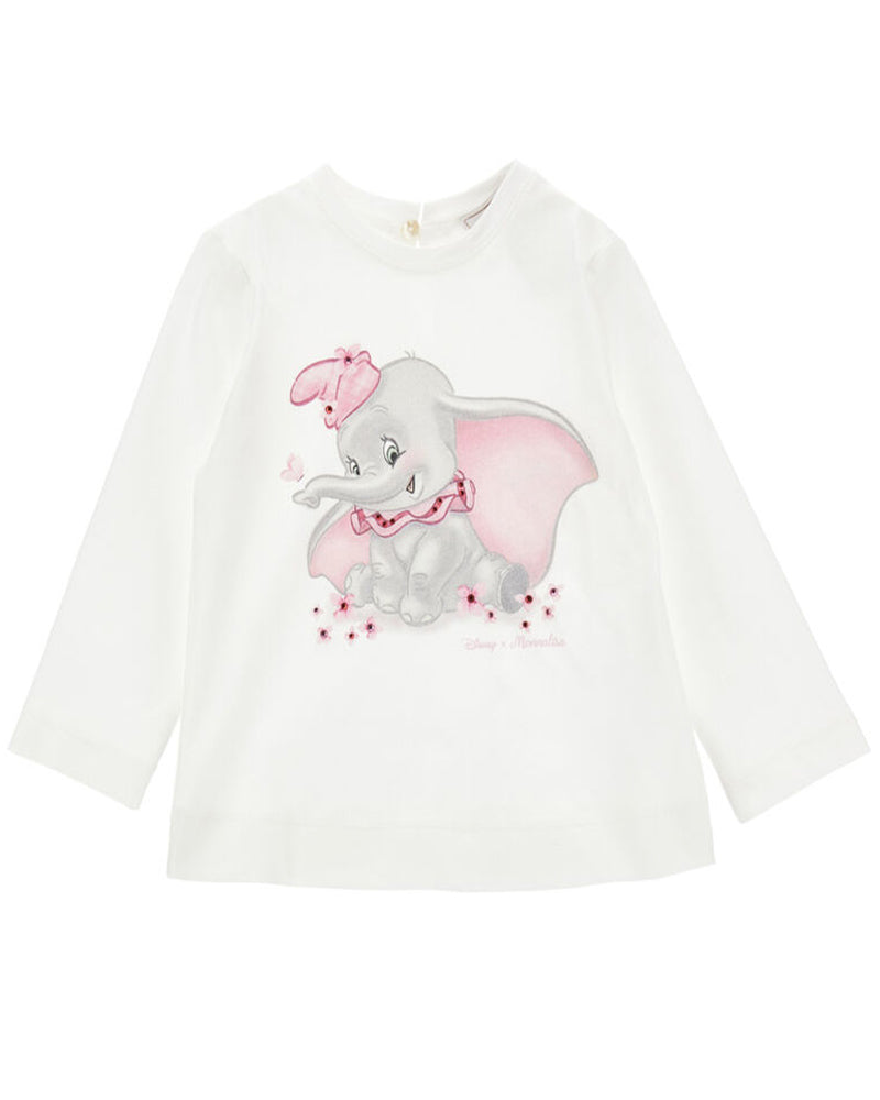 T-shirt girocollo realizzata in jersey di cotone a maniche lunghe, stampa Dumbo con applicazioni di strass sul davanti, chiusura con bottoncino sul retro.