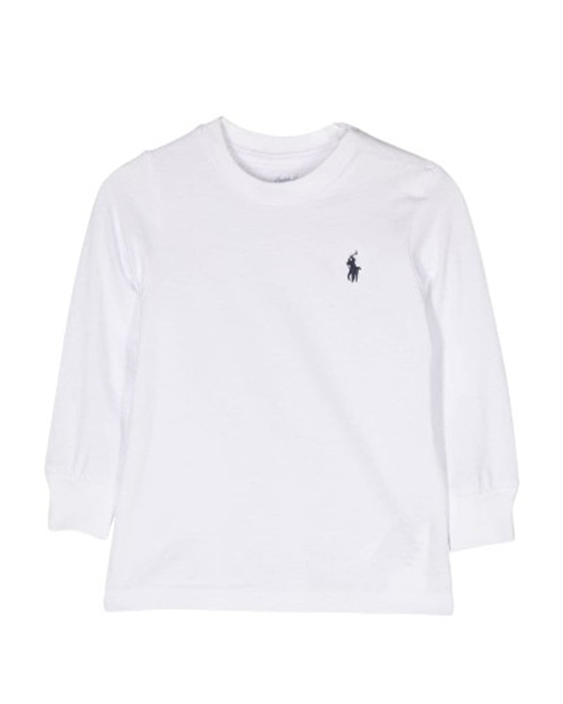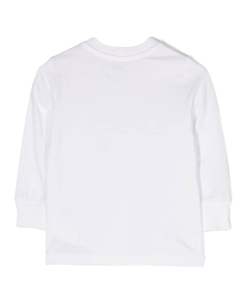 T-shirt realizzata in cotone, girocollo, maniche lunghe, logo ricamato in contrasto, apertura sulla spalla con clips.