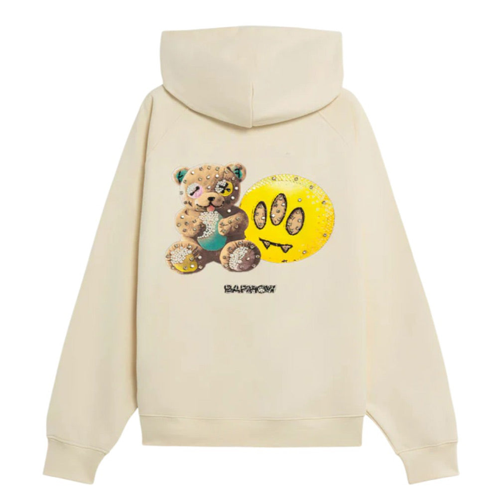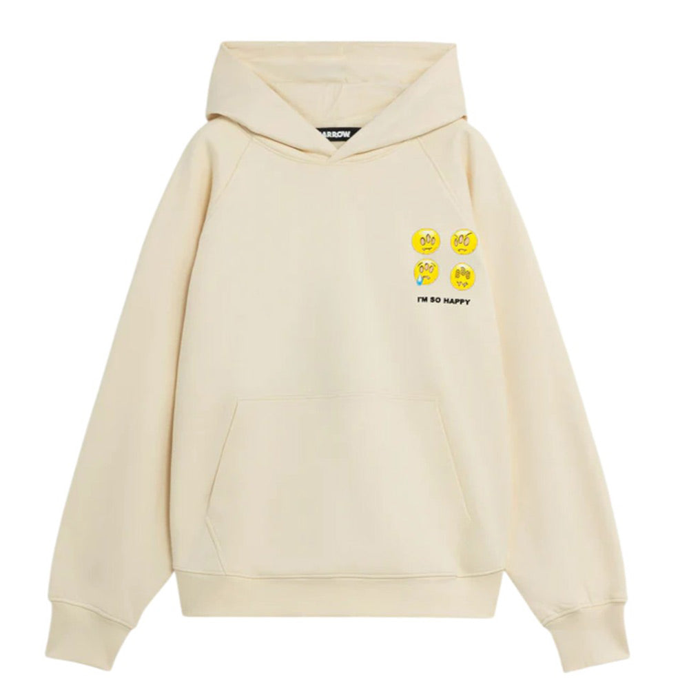 Felpa realizzata in cotone sgarzato, caratterizzata da cappuccio, maniche lunghe, tasca a marsupio sul davanti, polsi e orlo a coste. È decorata con stampa “I’m so happy” e grafiche smile sul petto e con maxi stampa sul retro con orsetto e smile impreziositi da applicazioni di perle.