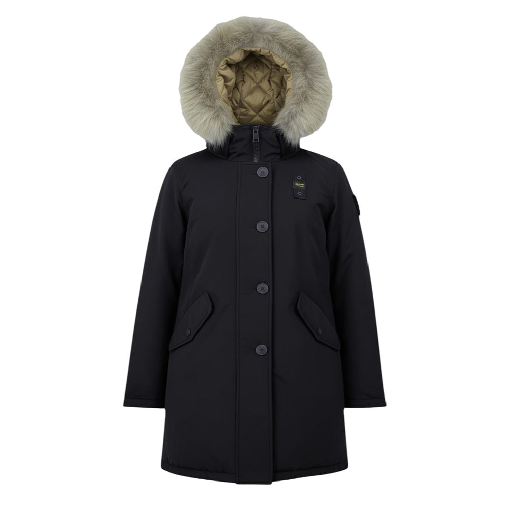 Introducing the Blauer Giubbino Lungo 19WBLGK03352 for girls, featuring a hood and natural fur for a warm and elegant look. The zip closure and American pockets make it comfortable and practical for any occasion. The interior is lined with eco-fur for unparalleled softness.