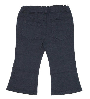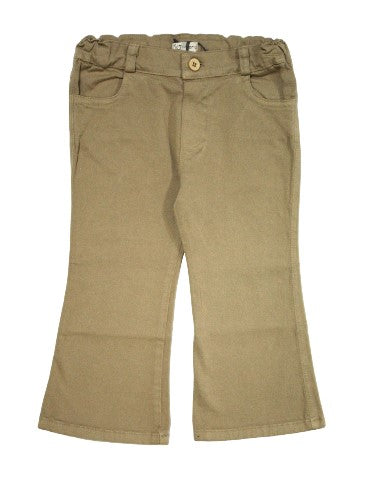 Cotton trousers, flared leg, elasticated waist, five-pocket style, button fastening.