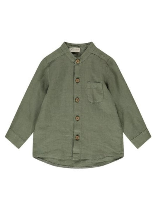 Shirt with mandarin collar, long sleeves, front button fastening, patch pocket on the front.