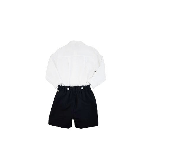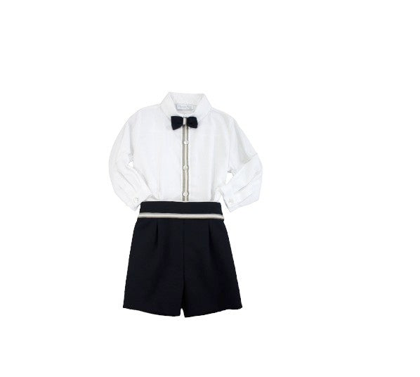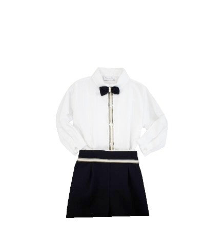 Ponto Por Ponto set consisting of a franella shirt with beige bands and trousers with matching gabardine bow tie. The shirt is tied to the trousers with hidden buttons.