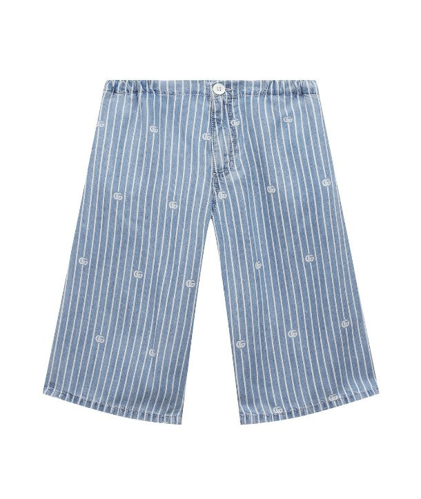 Girls' trousers made of cotton jersey, elasticated waist, front fastening with button and zip, side welt pockets, all-over logo print.