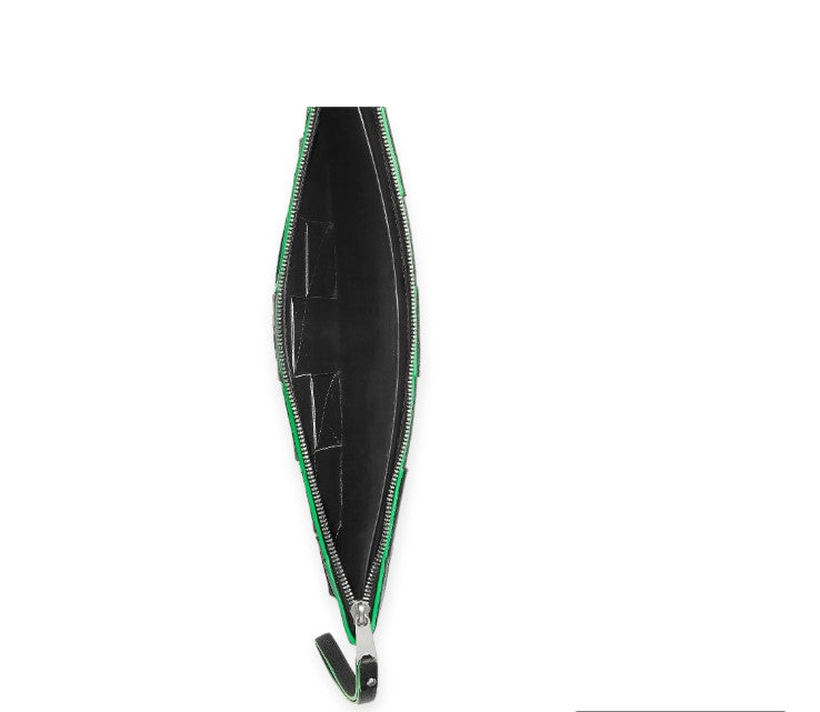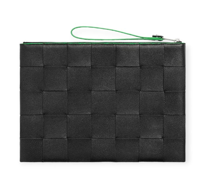 Bottega Veneta clutch in grained leather with Intreccio motif. Equipped with a removable handle with green inserts. Dimensions Height: 25 cm, Width: 35 cm, Depth: 1 cm