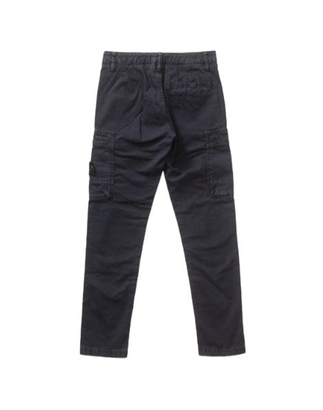 Cargo trousers, front closure with button and zip. Side American pockets, two patch pockets along the legs with iconic logo.