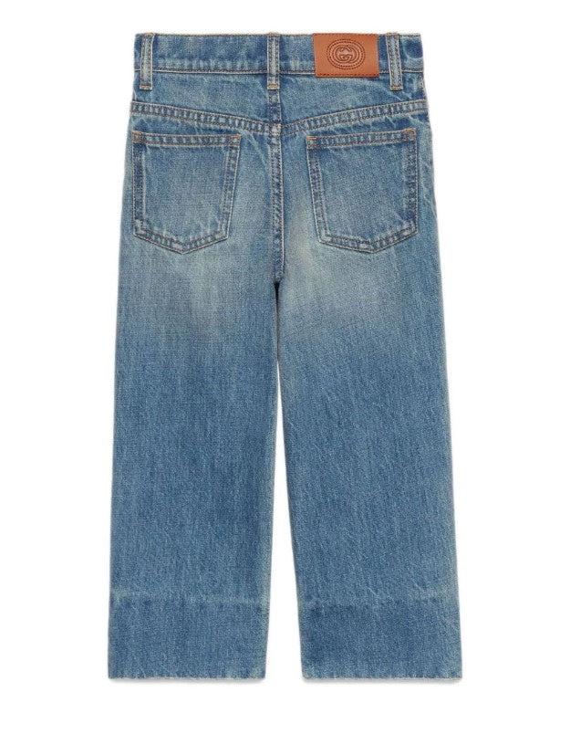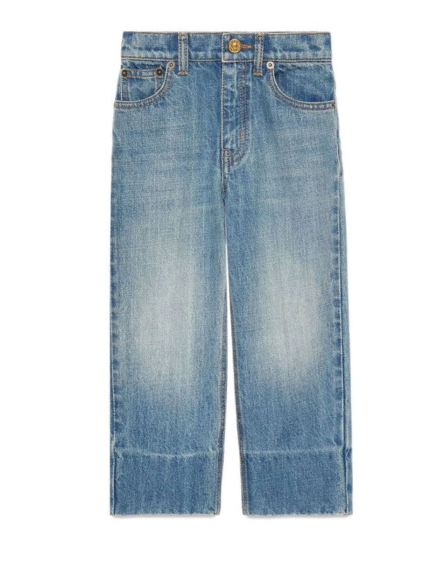 Cotton denim jeans, straight leg, five-pocket style, front fastening with button and zip.