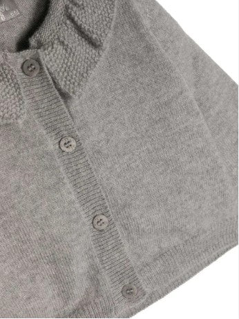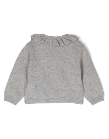 Wool cardigan sweater, ruffled collar, button fastening on the front.