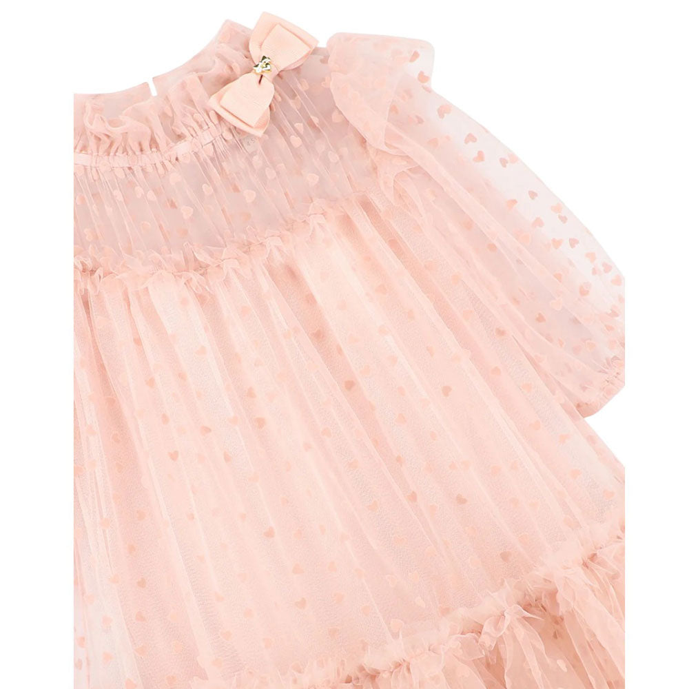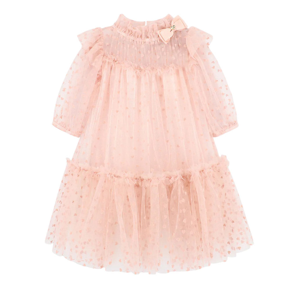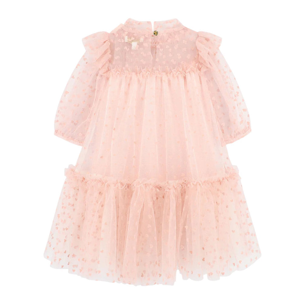 Questo voluminoso abito in tulle rosa cipria è perfetto per feste e occasioni speciali. Le maniche a sbuffo con polsini elasticizzati, le balze sulla gonna e delicati volant lungo la scollatura creano una silhouette incantevole. Completamente foderato in morbido misto cotone elasticizzato. L'abito è completato dal fiocco distintivo e dalla borchia a cuore dorato sulla scollatura, e si chiude sul retro con un bottone dorato.
