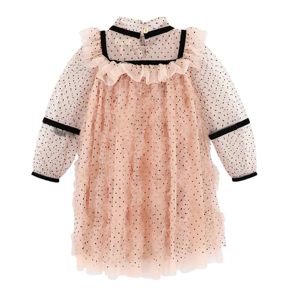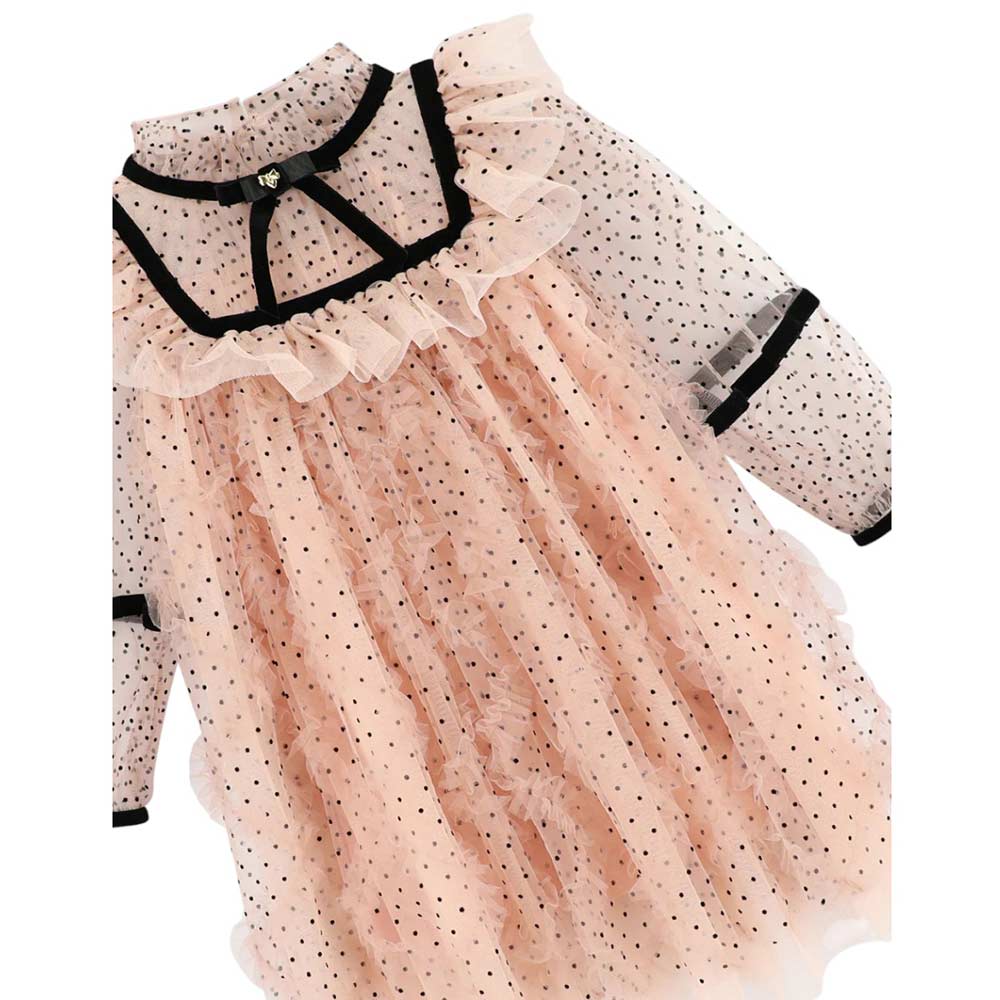 Abito rosa cipria realizzato in morbido tulle con un motivo a pois floccato e rifinito con delicate balze che scendono a cascata sul davanti. I dettagli in nastro di velluto nero su scollo, polsini e maniche aggiungono un sofisticato contrasto. Rifinito con un fiocco in grosgrain nero e il ciondolo a forma di cuore dorato firmato Angel's Face sul collo.