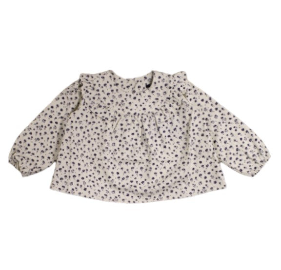 Shirt in floral micro-pattern fabric, ruffles at the neck, sleeves with elasticated cuffs, button fastening on the back.