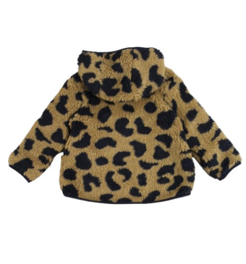Hooded jacket in animalier-print faux fur, zip fastening, side pockets.