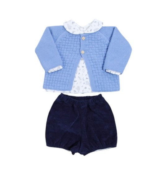 with patterned shirt, corduroy shorts and jacket with faux wood buttons