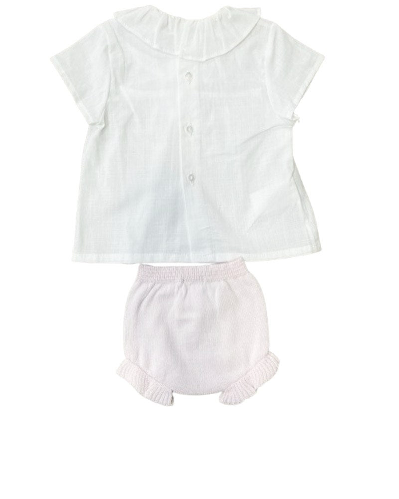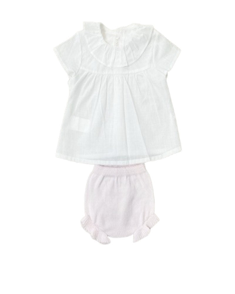 Camicina in misto lino con collo a rouches mezza manica abbinata alla culotte in filo con bottoncini in madreperla ai lati