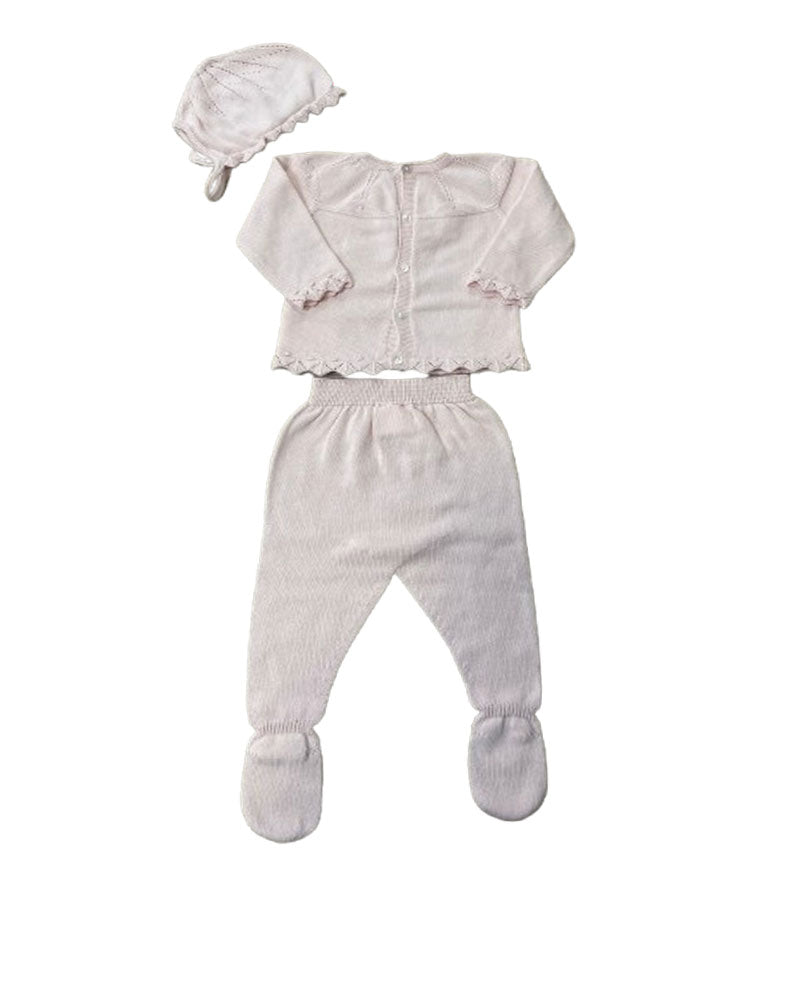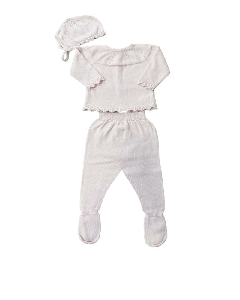 Tutina 2 pezzi in filo manica lunga senza collo fantasia nodini sul davanti bordi smerlati pantaloncino a ghetta con piedini completa di cuffia