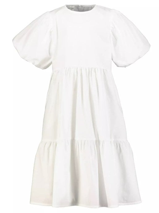 Crew neck dress, short balloon sleeves, flounced skirt.