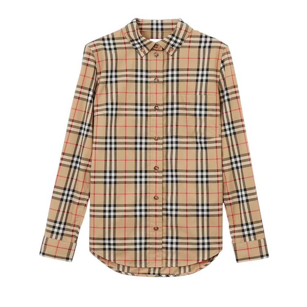 Camicia realizzata in popeline di cotone, con motivo Burberry Check. Presenta vestibilità slim, colletto button-down, chiusura frontale con bottoni, tasca applicata sul petto, maniche lunghe, polsi abbottonati e orlo curvo.