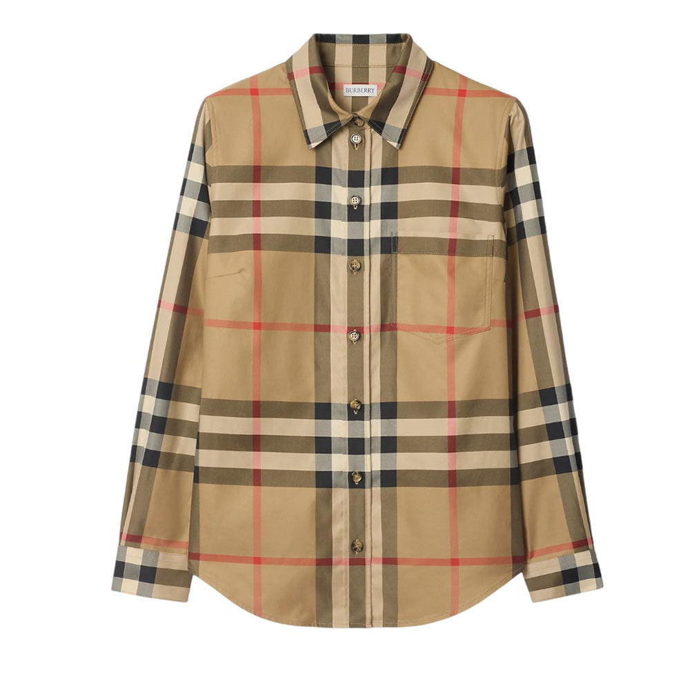 Camicia realizzata in popeline di cotone, con motivo Burberry Check nel caratteristico beige d'archivio. Presenta vestibilità slim, colletto a punta, chiusura frontale con bottoni, tasca applicata sul petto, maniche lunghe, polsi abbottonati e orlo curvo.