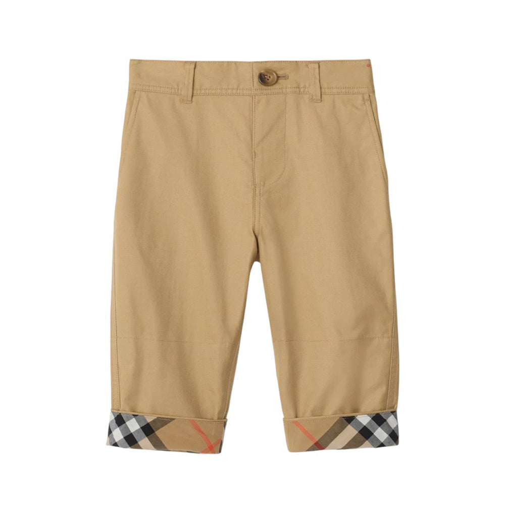 Pantaloni dritti realizzati in twill di cotone. Presentano chiusura frontale con bottone e zip, vita elasticizzata sul retro, due tasche laterali a bustina, una tasca posteriore a filetto e risvolti intessuti con il motivo Burberry Check nel caratteristico beige sabbia.
