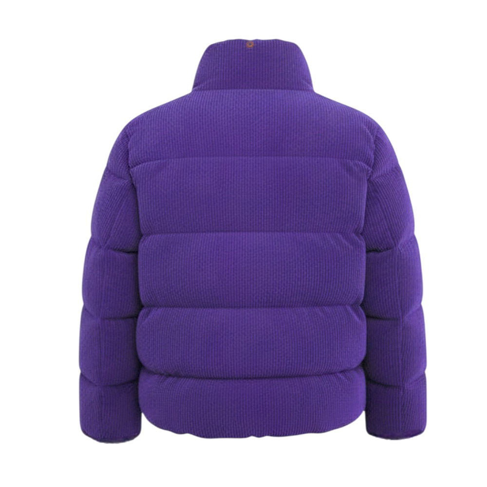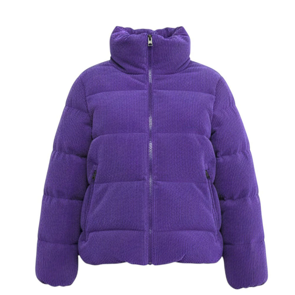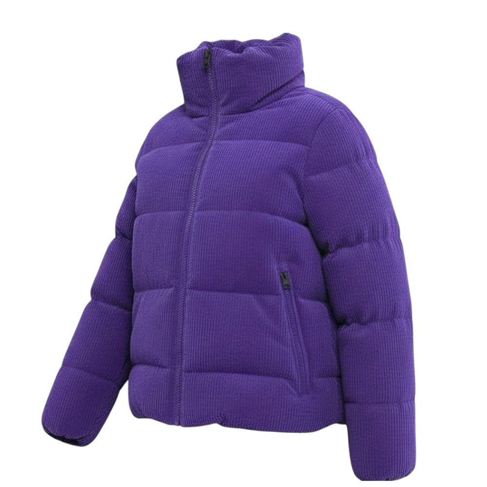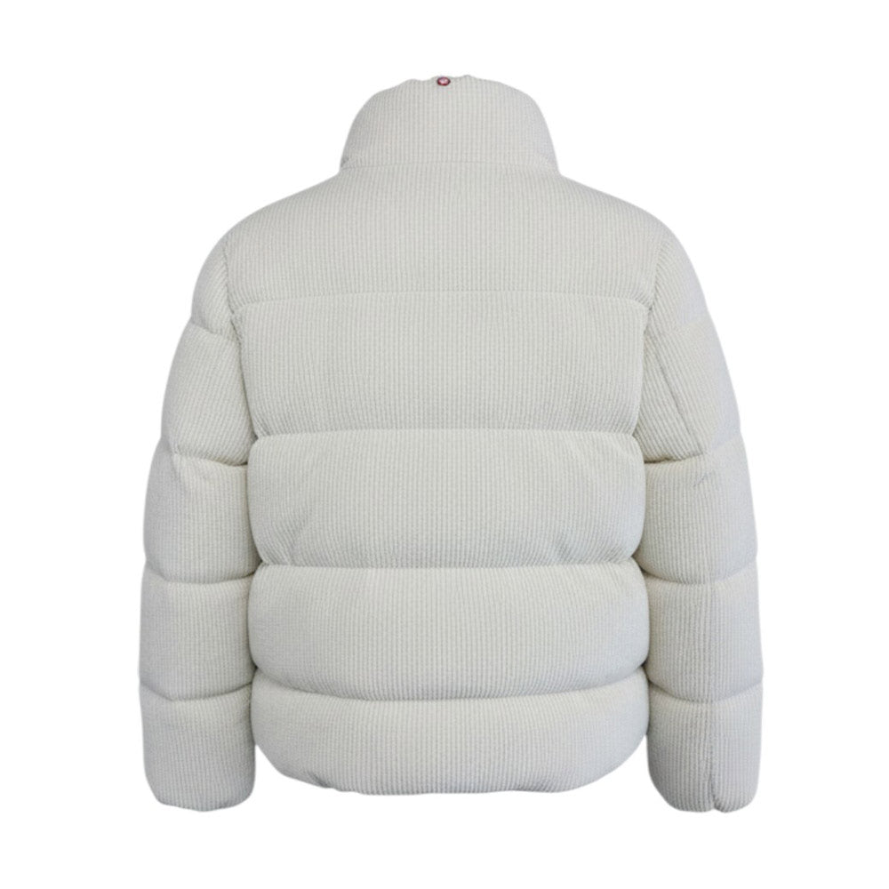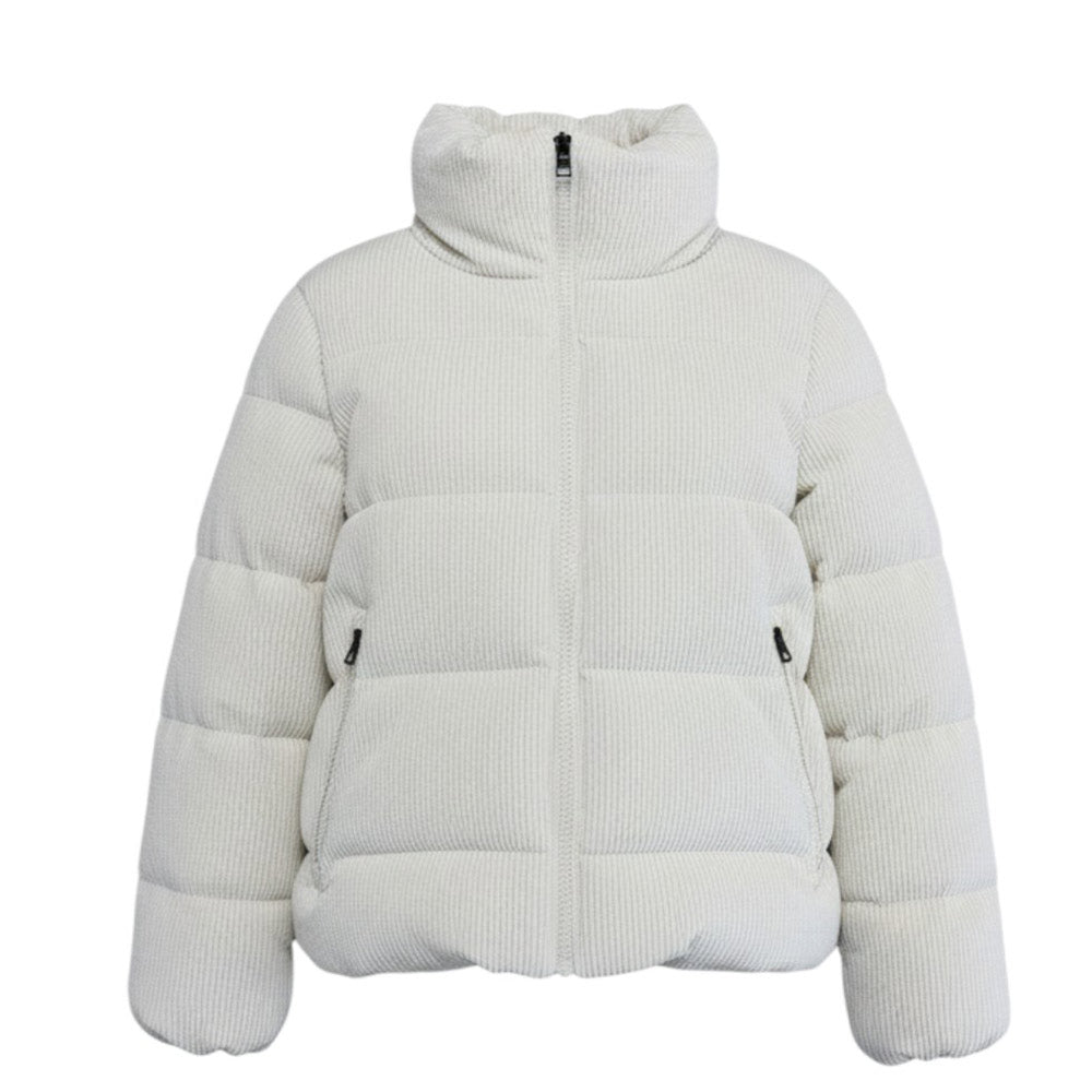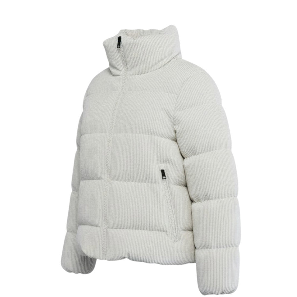 Piumino da donna Milka realizzato in velluto millerighe. Presenta collo alto, chiusura frontale con zip, imbottitura in piuma, maniche lunghe con polsi elasticizzati, due tasche laterali a filetto con zip e orlo dritto. È decorato con patch logo applicata sul retro.