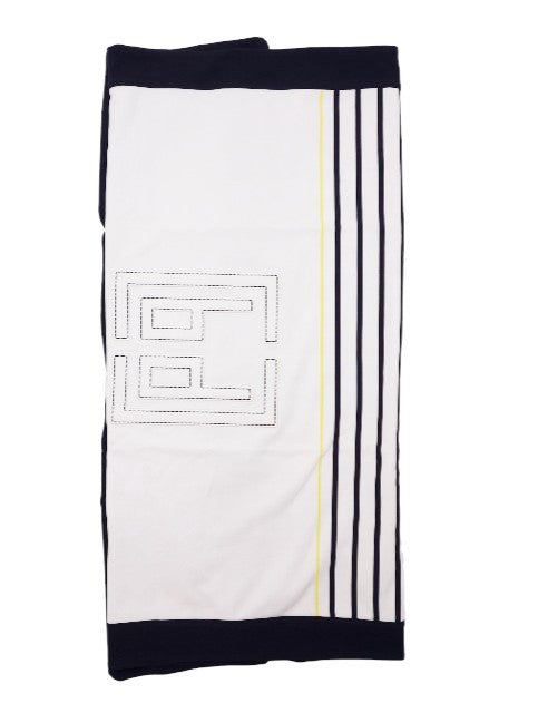 Carlo Pignatelli Baby Blanket in white cotton with blue and yellow details. Model with blue border and central sewn brand logo. White back with all-over brand logo prints.