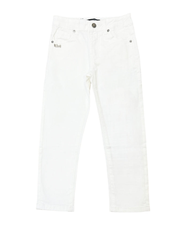 Jeans realizzato in denim, modello cinque tasche, abbottonatura frontale con bottone e zip.
