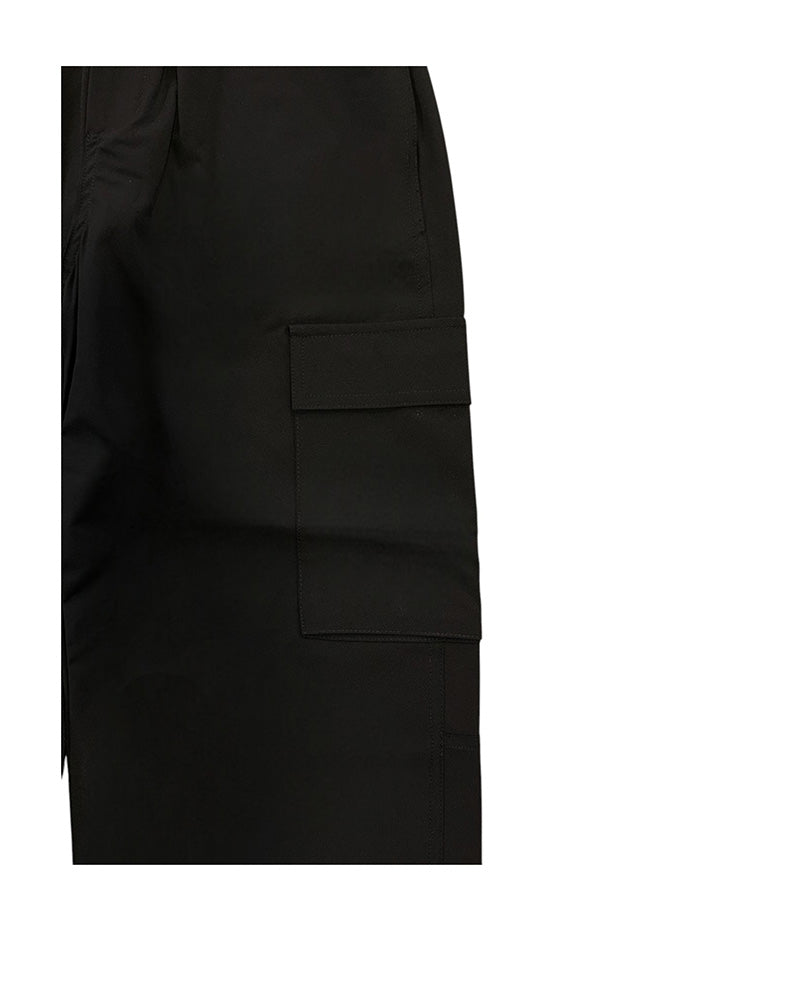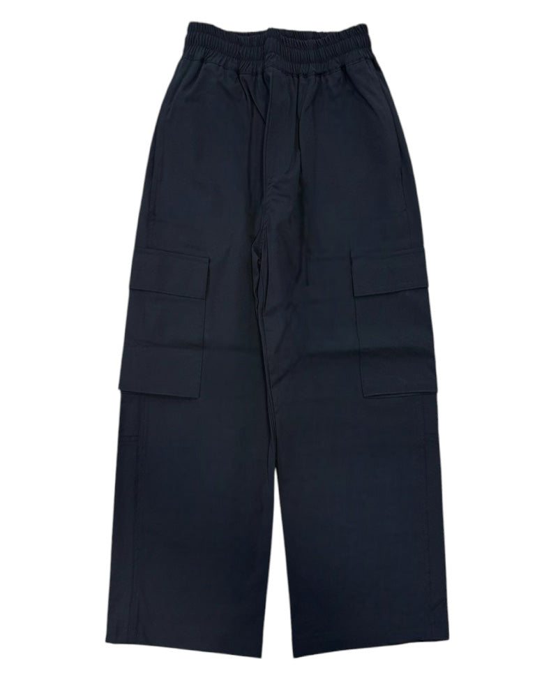 Pantaloni cargo da bambino con vita elasticizzata e coulisse interna, tasche laterali, tasche cargo sui lati, taschino posteriore con patch logo applicata.