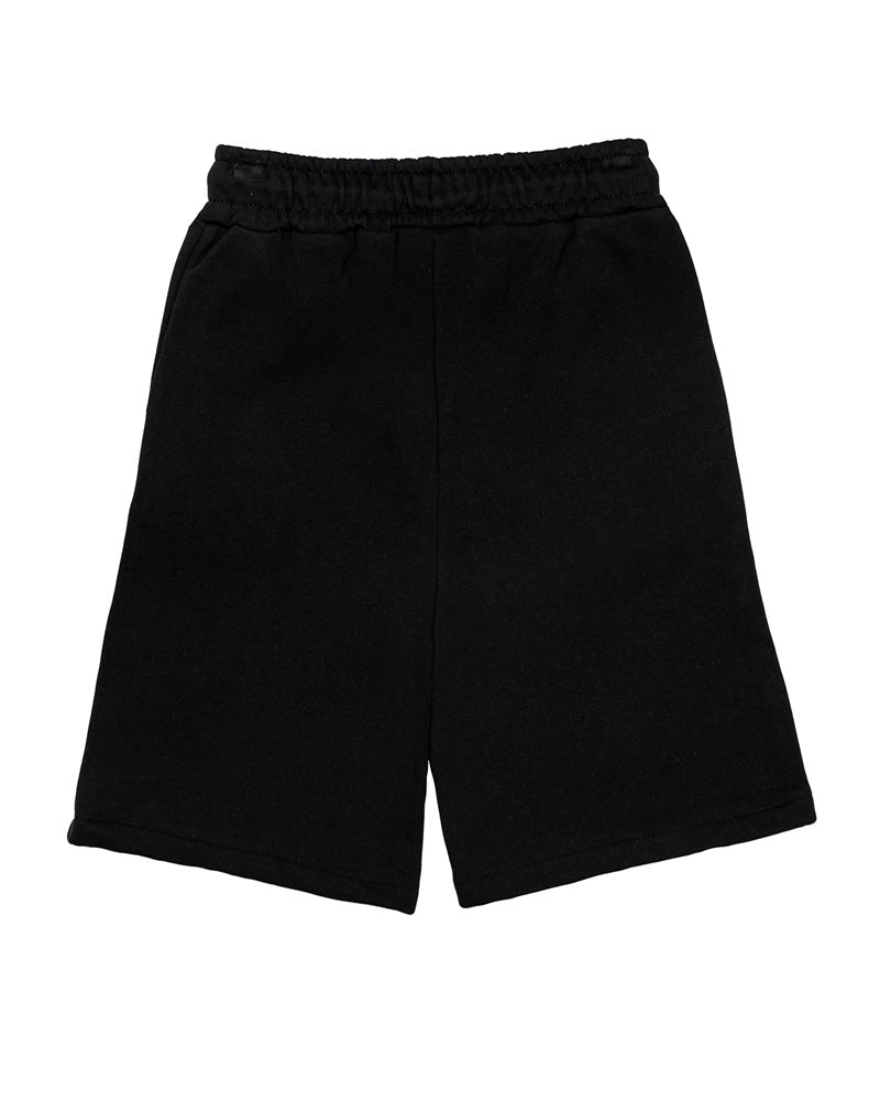 Bermuda realizzato in felpa di cotone, vita elasticizzata, tasche laterali, logo stampato in contrasto.